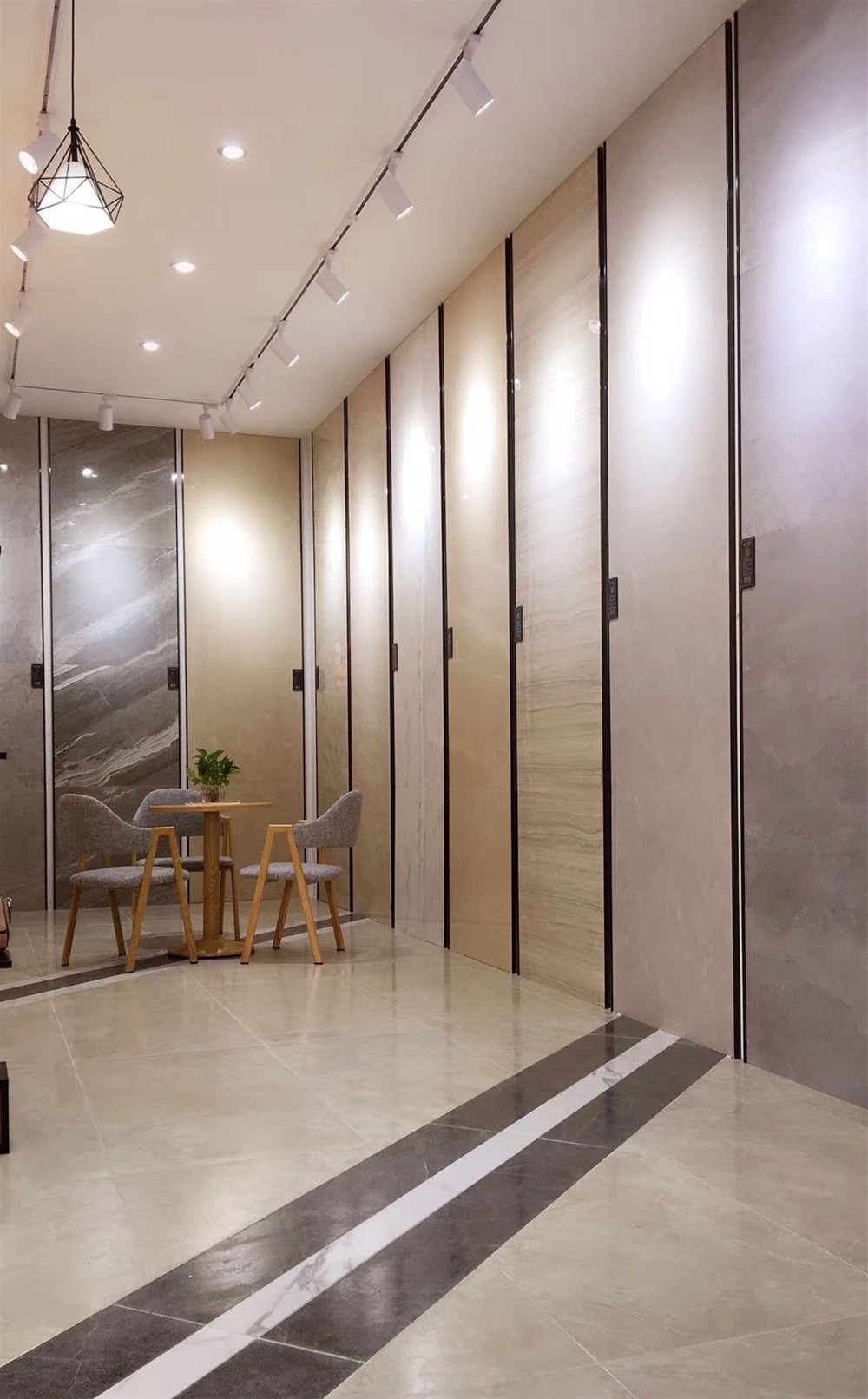 這是緞光釉卡拉卡白鋪貼的形象墻,白色的基調讓空間看起來寬敞明亮,灰色大紋理散發著優雅的氣息。