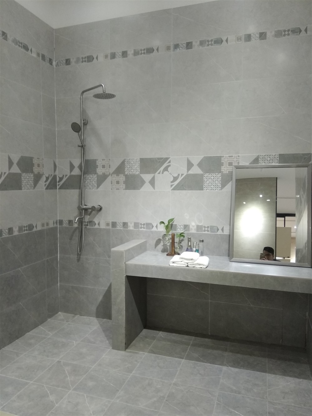 這是衛生間模擬間,瓷磚選用金艾陶噴墨瓷片,上墻下地都能鋪,顏色是今年流行的灰色調,一深一淺搭配出層次感,也不至于單調。這款瓷片也可作廚房用磚。