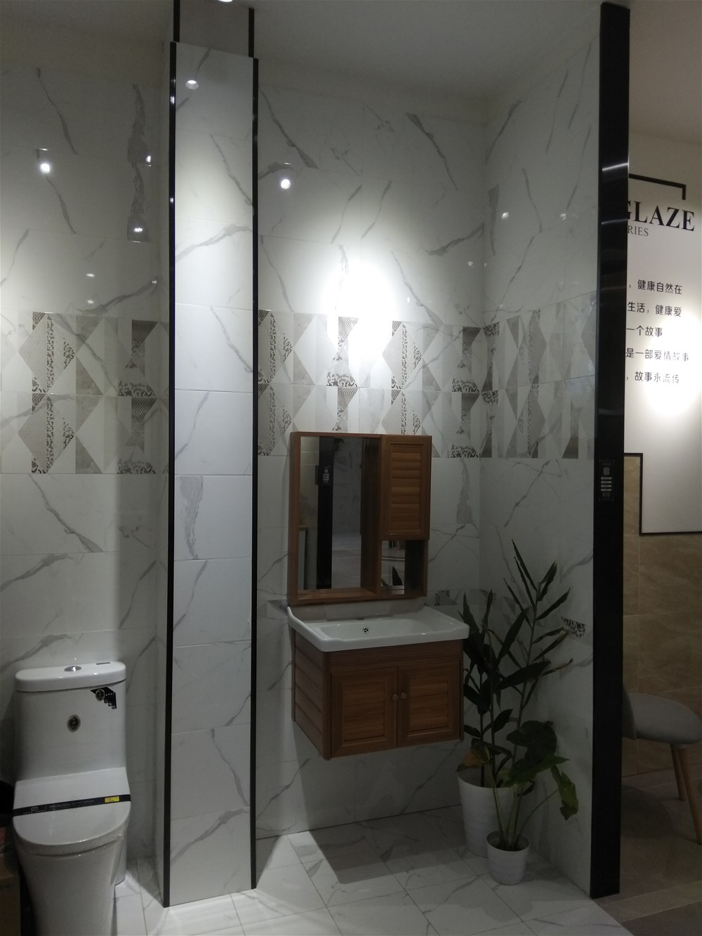 這是緞光釉鋪貼的衛生間模擬間,衛生間講究私密性,設計師一般考慮使用深色磚,緞光釉防滑度高,非常適合廚衛、陽臺地磚墻磚使用。