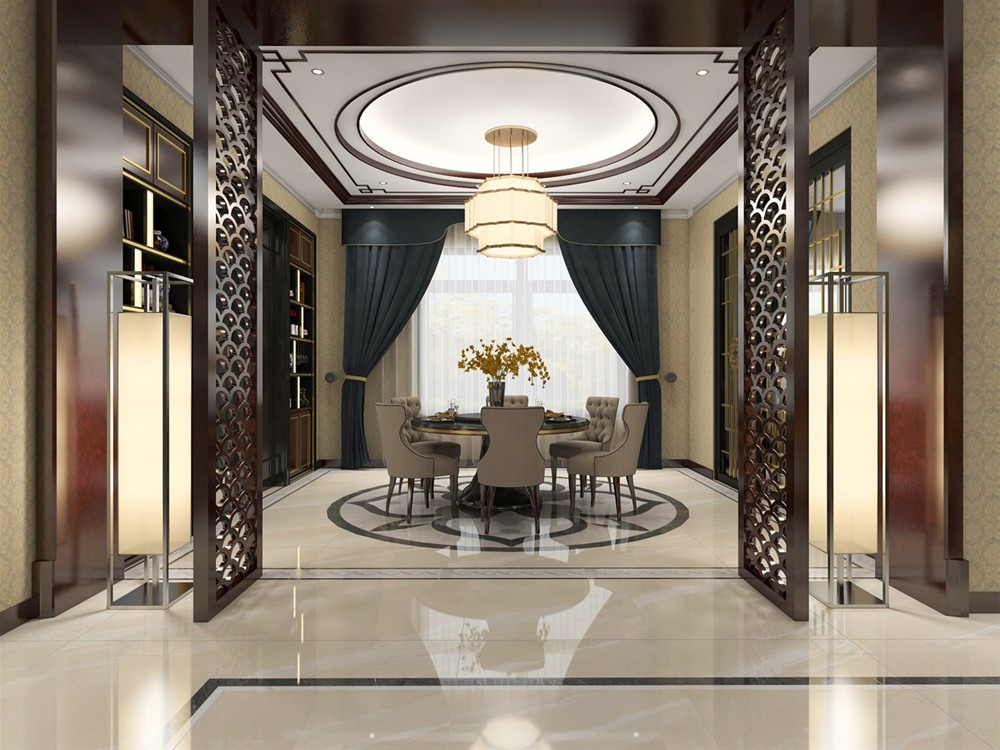 餐廳作為和客廳貫通的空間,利用相協(xié)調(diào)的深木色酒柜為整墻背景,選擇富有中式格調(diào)的地磚拼花,象形荷花圖案,整體空間呈現(xiàn)素雅而明媚,傳統(tǒng)而不失現(xiàn)代,慢慢生出了整個(gè)空間的“魂”。讓人覺得在此用餐是為樂事!