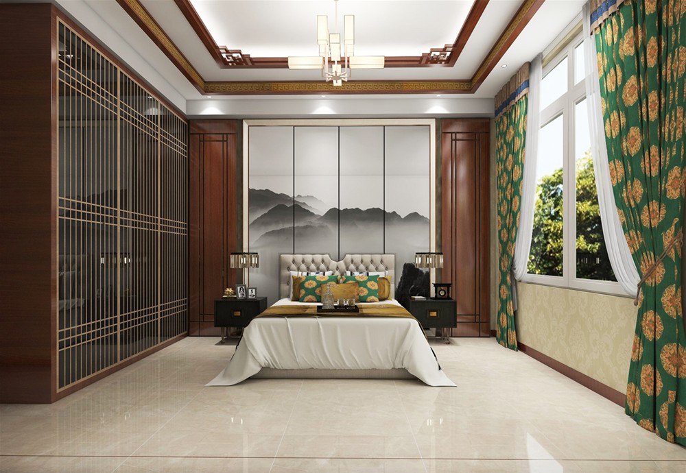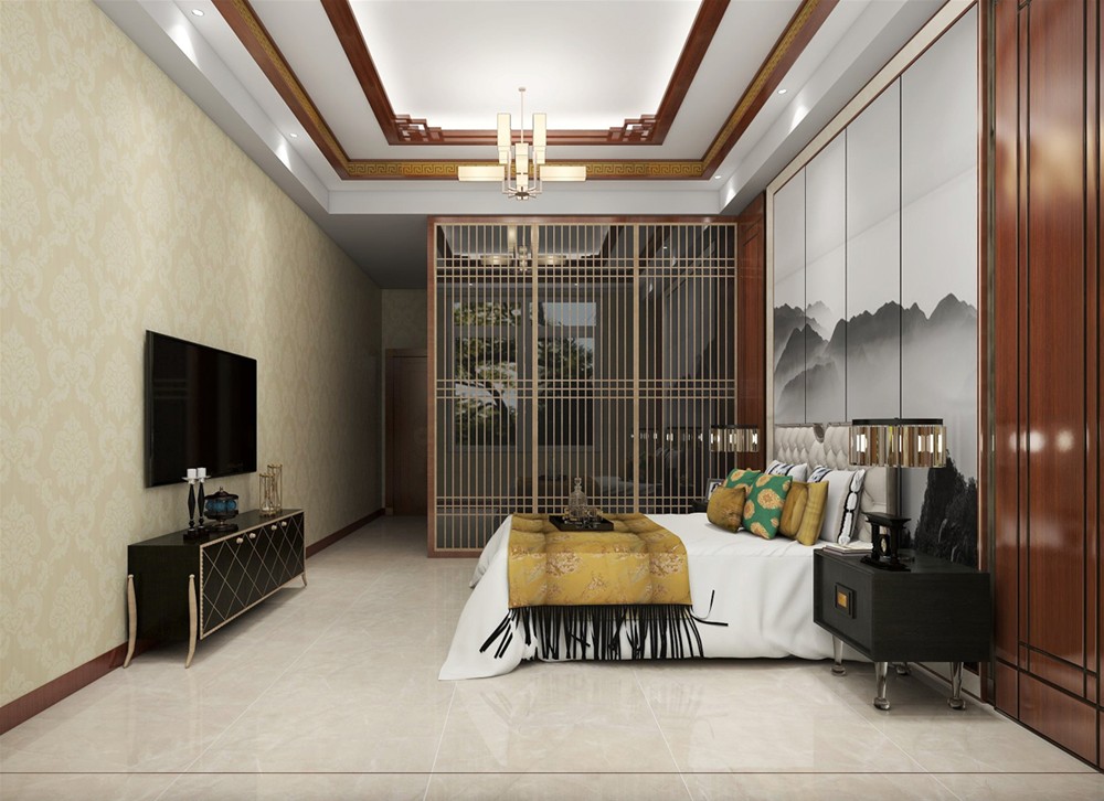 主臥床背景仍利用木色為主構(gòu)架融會(huì)貫通,再加以富有意境的山水壁畫作為更深層的點(diǎn)綴,讓人們?cè)谡麄€(gè)空間里感受傳統(tǒng)文化帶來的熏陶與動(dòng)感,生命也變得溫潤(rùn)充盈,富有韻味。