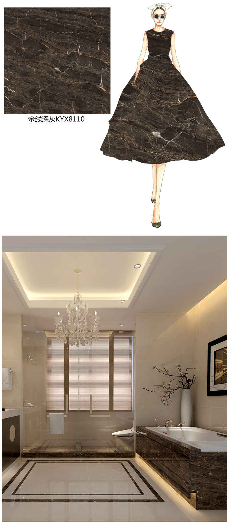 金艾陶金線深灰,將錯落有致的紋理溶入柔和的灰色里,花紋均勻細致,光澤度高,將委婉的柔美呈現在空間里,裝飾空間具有獨特的奢華和柔和。