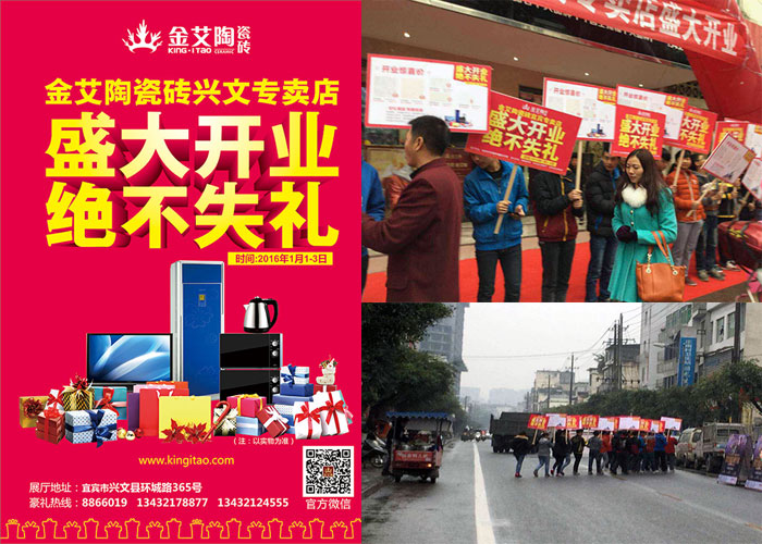 2016年1月1日,這是個值得紀念的日子,陶瓷一線品牌金艾陶瓷磚打響了2016年第一炮。四川宜賓市興文縣金艾陶瓷磚專賣店,位于宜賓市興文縣環(huán)城路365號舉辦了盛大開業(yè)的慶典。經(jīng)過多個日夜的精心策劃與準備,整條街上到處都洋溢著歡樂的氣氛、熱鬧非凡,開業(yè)花籃、把門口堆滿。眾多業(yè)主們共同見證了這一盛況!
